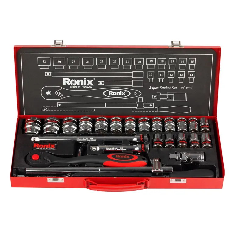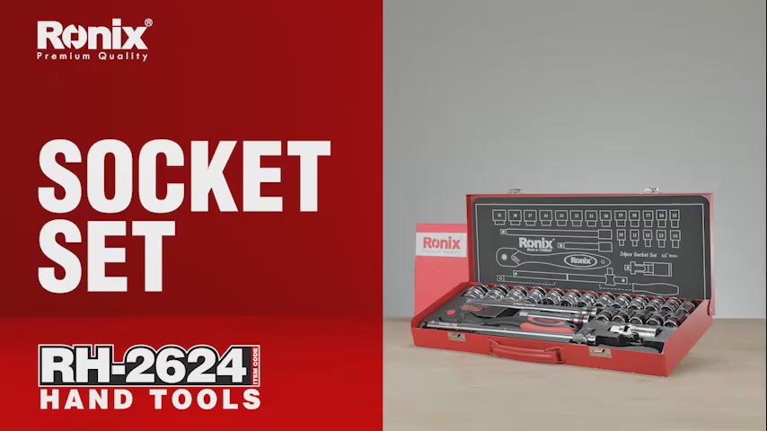 جعبه بکس 24 عددی 1/2 اینچ رونیکس مدل RH-2624، همراهی حرفه‌ای و مقاوم برای شما است و از مواد باکیفیت سخت‌کاری‌شده با گشتاور بالا تولید شده است. سوکت‌های این مجموعه بکس ساخت تایوان، از فولاد کروم وانادیوم با روکش آینه‌ای ساخته شده‌اند که مقاومت بالایی در برابر زنگ‌زدگی و خوردگی فراهم می‌کنند.