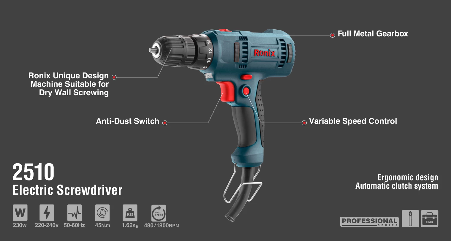پیچگوشتی برقی دو سرعته 2510 رونیکس، مجهز به موتور قدرتمند 230 وات است؛ با حداکثر گشتاور 25 نیوتنمتر و حداکثر سرعت 1800 دور بر دقیقه کار میکند. این گشتاور و سرعت برای باز و بستهکردن انواع پیچهای نو و قدیمی در شرایط مختلف اعمال میشود. همچنین، سرعت با استفاده از کلیدی که در بخش بالای بدنه محصول تعبیه شده است، در دو حالت صفر تا 480 دور بر دقیقه و صفر تا 1800 دور بر دقیقه قابل تنظیم است. بهاینترتیب، میتوانید از این ابزار برای فعالیت روی سطوح مختلف استفاده کنید.